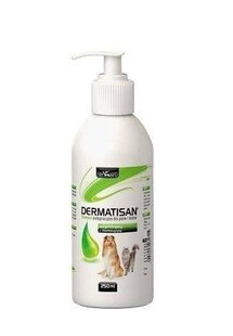 Szampon Dermatisan 250 ml - pielęgnacyjny szampon dla psów i kotów z problemami z łojotokiem, zawierający biosiarkę. Działanie szamponu polega na oczyszczaniu i regulacji pracy gruczołów łojowych, poprawie kondycji sierści i łagodzeniu podrażnień.