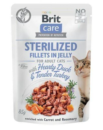 Brit Care Sterilized Fillets in Jelly to doskonała mokra karma dla kotów sterylizowanych, która dostarcza im odpowiednią dawkę białka, witamin i minerałów niezbędnych do zachowania zdrowia, energii i witalności. Karma składa się z pysznych kawałków mięsa kurczaka, kaczki i indyka w aromatycznym sosie, który ucieszy podniebienia każdego kota. W przeciwieństwie do innych karm na rynku, Brit Care Sterilized Fillets in Jelly nie zawiera sztucznych barwników, soi, zbóż i cukru, dzięki czemu jest odpowiednia dla kotów z wrażliwym układem pokarmowym. Składniki takie jak rozmaryn, marchew i tauryna są dodatkowo wzbogacone, aby dbać o wzrok, mięśnie i pracę serca czworonogów.