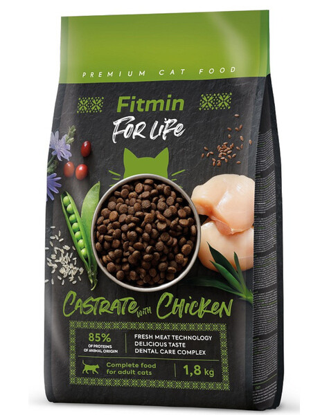 Fitmin For Life Castrate Chicken - karma dla kotów dorosłych po kastracji lub ze skłonnością do nadwagi. Zawiera 85% składników pochodzenia zwierzęcego. Mięso z kurczaka jest smaczne i lekkostrawne, a obecność antyoksydantów wspiera odporność organizmu kota.