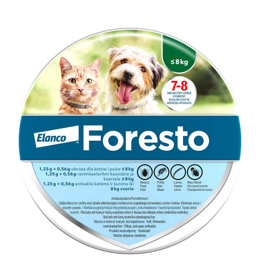 Obroża Foresto to produkt służący do zwalczania i ochrony przed inwazją kleszczy z gatunku Rhipicephalus sanguineus orazIxodes ricinus oraz pcheł Ctenocephalides canis, Ctenocephalides felis u psów i kotów. To wyjątkowo skuteczne i ekonomiczne rozwiązanie: pewna i pełna ochrona na cały sezon. Działa również skuteczne na larwy, nimfy i dorosłe osobniki kleszczy. Obroża jest wodoodporna.