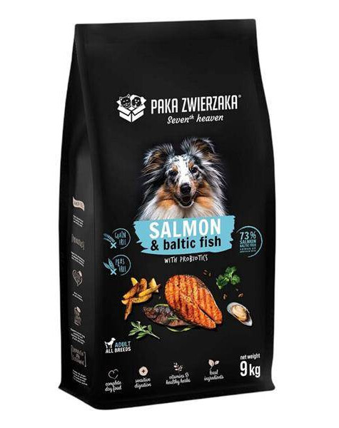 Paka Zwierzaka Seventh Heaven Salmon & Baltic Fish to pełnoporcjowa psów dorosłych. Bezzbożowa formuła zmniejsza ryzyko wystąpienia reakcji alergicznych, dzięki czemu karma może być spożywana przez psy wrażliwe i psich alergików. Wysokiej jakości naturalne składniki są odpowiednio wyselekcjonowane dla zdrowia czworonoga. Zawartość oleju z łososia wspomaga kondycję skóry i sierści. Karma dostarcza odpowiednie wartości odżywcze niezbędne dla zdrowia organizmu. Paka Zwierzaka Seventh Heaven jest karmą hipoalergiczną, dlatego jest szczególnie polecana psom o wrażliwym żołądku i psów z nietolerancją pokarmową. Warto wspomnieć, że pokarm oprócz zalet pozytywnie wpływających na zdrowie jest również bogactwem doskonałego smaku. Kwasy tłuszczowe Omega 3 i Omega 6 wykazują działanie wspierające prawidłowe funkcjonowanie układu immunologicznego. Dodatkowo wysoka smakowitość uzyskana za pomocą zawartości łososia i ryb bałtyckich zachęci do jedzenia nawet najbardziej wybrednego psiaka.