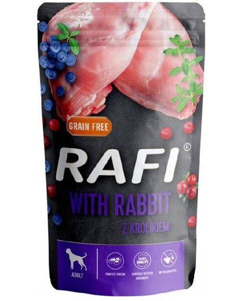 Receptura mokrej karmy Rafi z królikiem bazuje na nowoczesnych normach i zaleceniach dotyczących prawidłowego żywienia dorosłych psów. Jej skład w pełni pokrywa zapotrzebowanie czworonoga na niezbędne dla jego organizmu składniki odżywcze, mineralne i witaminy.Pełnowartościowe białko i minerały