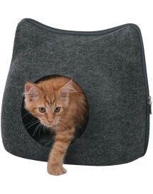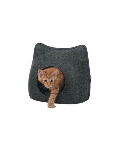 Legowisko typu budka z materiału imitującego filc. Ma stabilny kształt i materiał odporny na brud. W środku poduszka z pluszową pokrywą i wypełnieniem poliestru, pikowana.