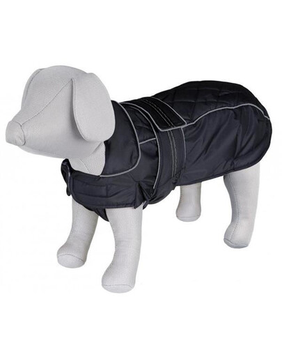 Wykonany z poliestru, oddychający, chroni przed wiatrem, deszczem i zabrudzeniami. Ubranko jest ciepłe i komfortowe dla psów, dzięki wewnętrznej warstwie z flauszu i podszewce nadaje się na jesienne i zimowe spacery. Odblaskowe paski zwiększają widoczność psa, a tym samym jego bezpieczeństwo, płaszczyk posiada otwór na wpięcie smyczy. Krój ubranka został dopasowany do sywetki mopsów i buldogów.