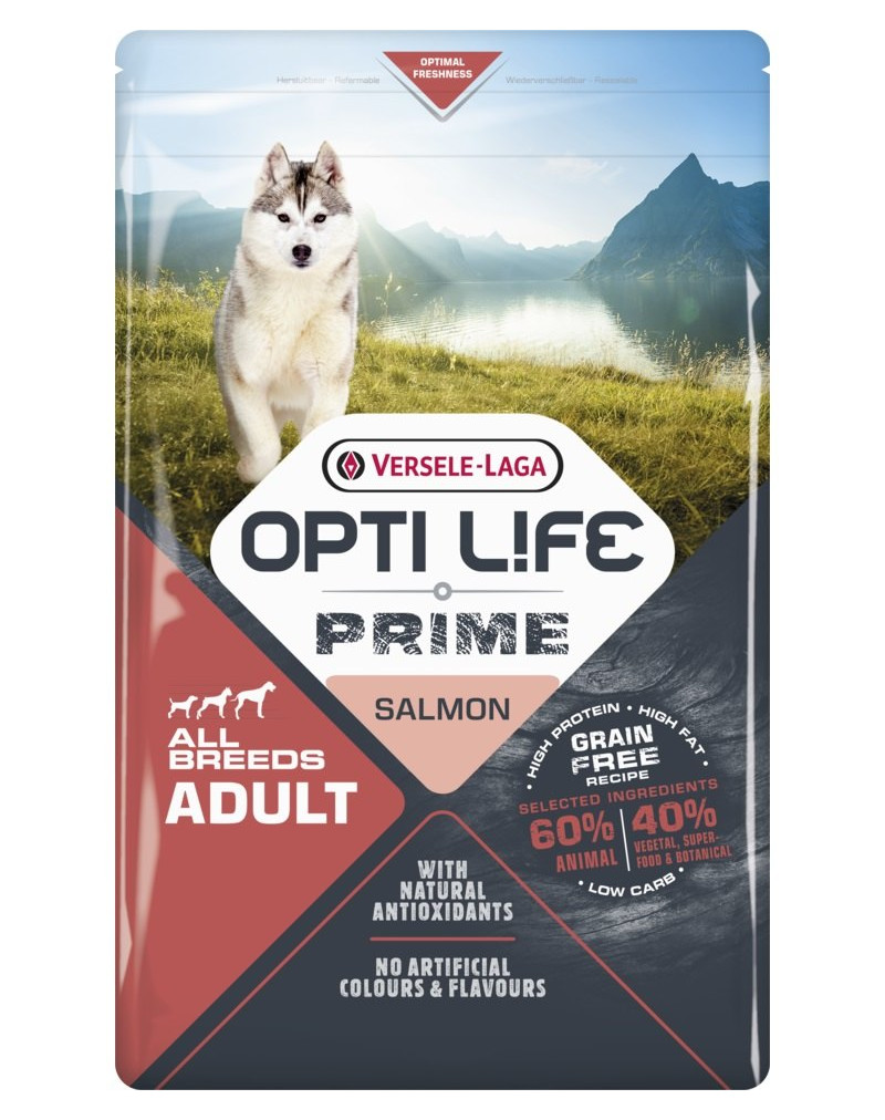 Z Opti Life Prime Adult Salmon, zapewniasz swojemu psu kompletny i smaczny, najwyższej jakości posiłek, pełen wartościowych składników odżywczych. Nasza bezzbożowa formuła jest bogata w białko i tłuszcze oraz niskowęglowodanowa. To idealna kompozycja, stworzona na bazie najwyższej jakości, smakowitych i naturalnych składników, zapewniających energię na dzień pełen przygód.