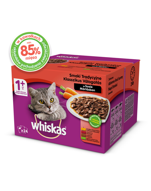 Wybór dań w tradycyjnych smakach z warzywami w sosie to zestaw starannie przygotowanych, kompletnych i zbilansowanych mokrych karm dla dorosłych kotów (powyżej 1. roku życia). Zestaw zawiera aż 24 saszetki w 4 uwielbianych przez koty smakach: kurczak z zielonym groszkiem, wołowina, indyk oraz jagnięcina z marchewką.Każde danie Whiskas w sosie to pokarm pełnoporcjowy, więc zaspokoi wszystkie potrzeby żywieniowe Twojego kota, dostarczając mu potrzebnej energii i niezbędnych składników odżywczych.